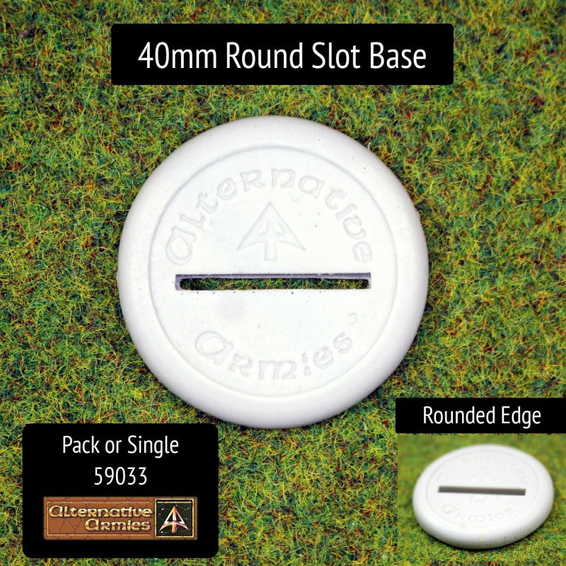 This pack contains ten resin 'slot bases' with each base being 40mm Round with a slot which is 25mm long. It will fit larger than Human size miniatures such as Ogres.