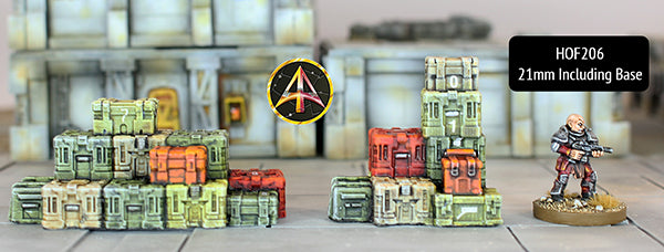 This code contains five different 15mm resin pieces giving you a scatter terrain for a cargo bay, space port or warehouse. Just the thing for modern, near future, science fiction and other gaming. You can select a set of five pieces or using the menu on the page select any of the pieces (A to E) in any quantity allowing total choice! .
