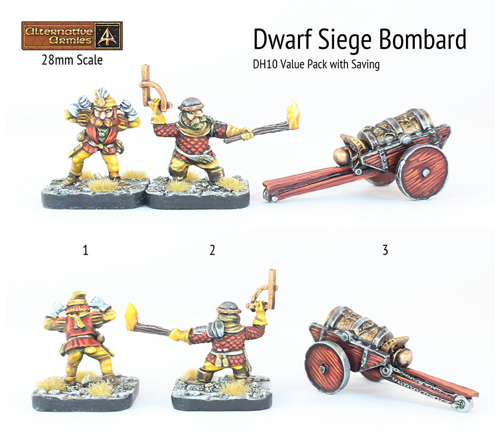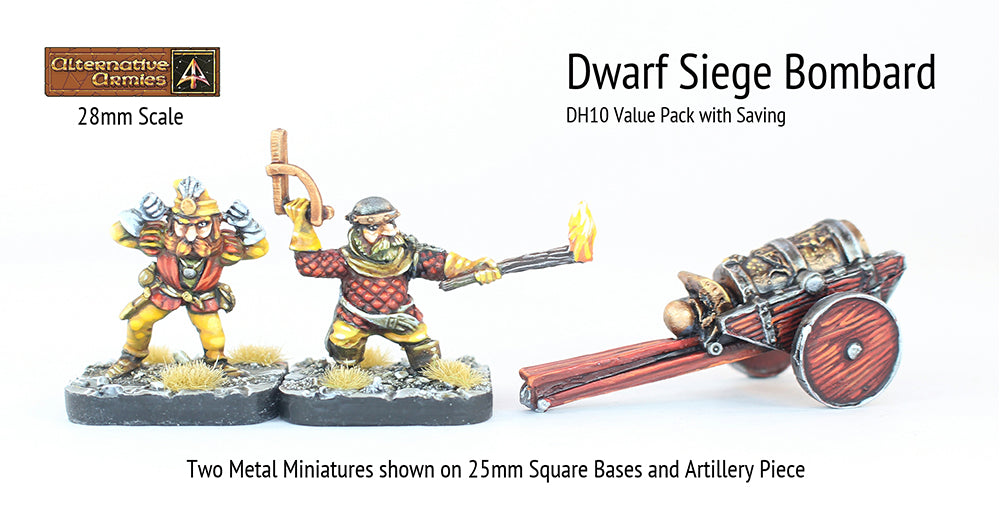 This code contains three different 28mm metal miniatures. Poses (average height 24mm) sculpted by Andy Cooper for Alternative Armies in the DH years of 1993-96. The Bombard is in three pieces and assembled is 50mm long.