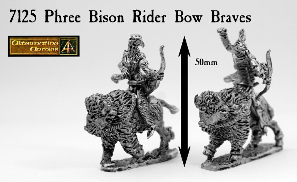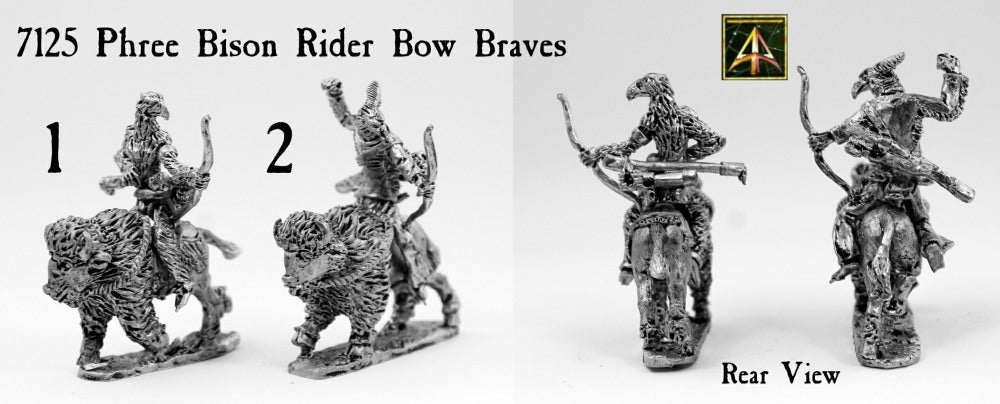 This code contains two different 28mm scale metal Phree Riders and two different Bisons upon which they ride.  A Brave pulling Bow (1), a Brave loosing Bow (2).