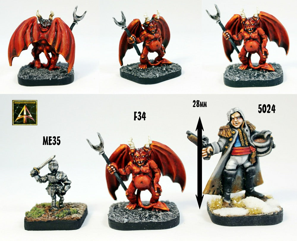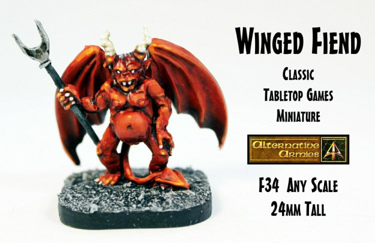 Summoned to the mortal realms or brought by magic to the lands of reality the Winged Fiend will do your bidding in a pact which will cost you your soul! This code contains one metal miniature supplied in two pieces these being the fiend holding pitchfork and a set of wings. It is 24mm to the top of the horns.