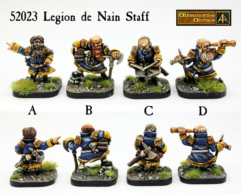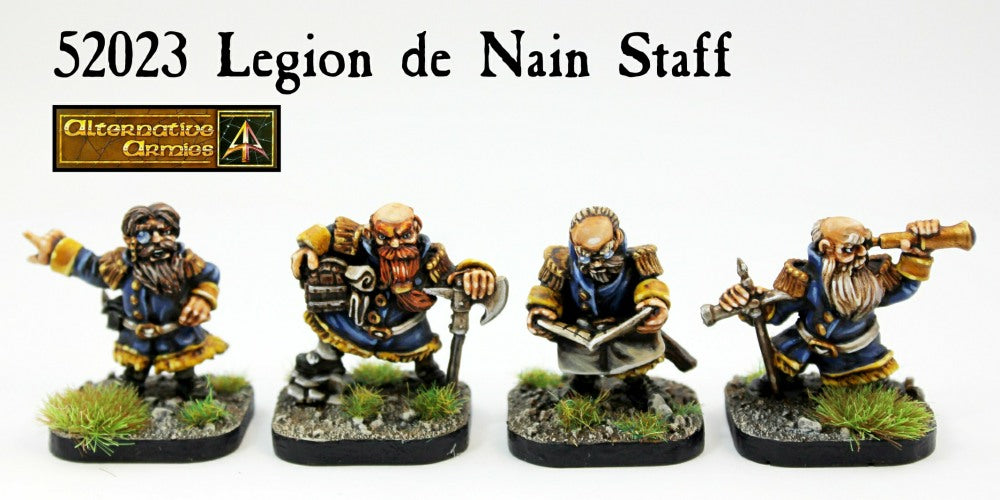 They are Dwarf officer with monocle pointing and slung axe (A), bare headed Dwarf paymaster with axe and coin chest under his arm (B), bare headed Dwarf aide studying maps and papers with slung axe (C) and Dwarf with telescope and hammer (D).