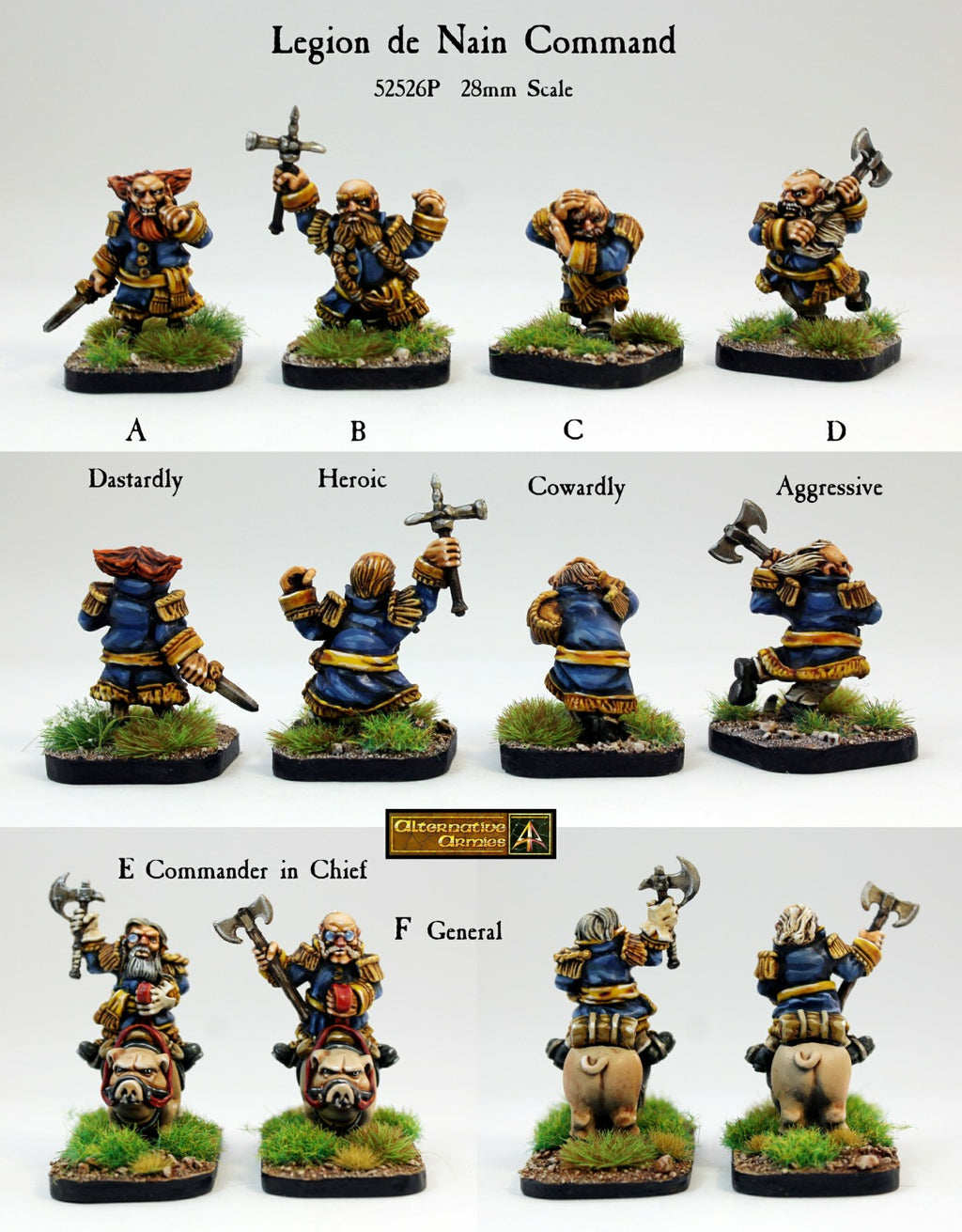 Four Officers on foot (A) Dastardly, (B) Heroic, (C) Cowardly, (D) Aggressive and two mounted officers a (E) Commander in Chief and (F) a General both on Pummilig Pigs. Miniatures are from this code. Each Dwarf is about 22mm to the eyeline.