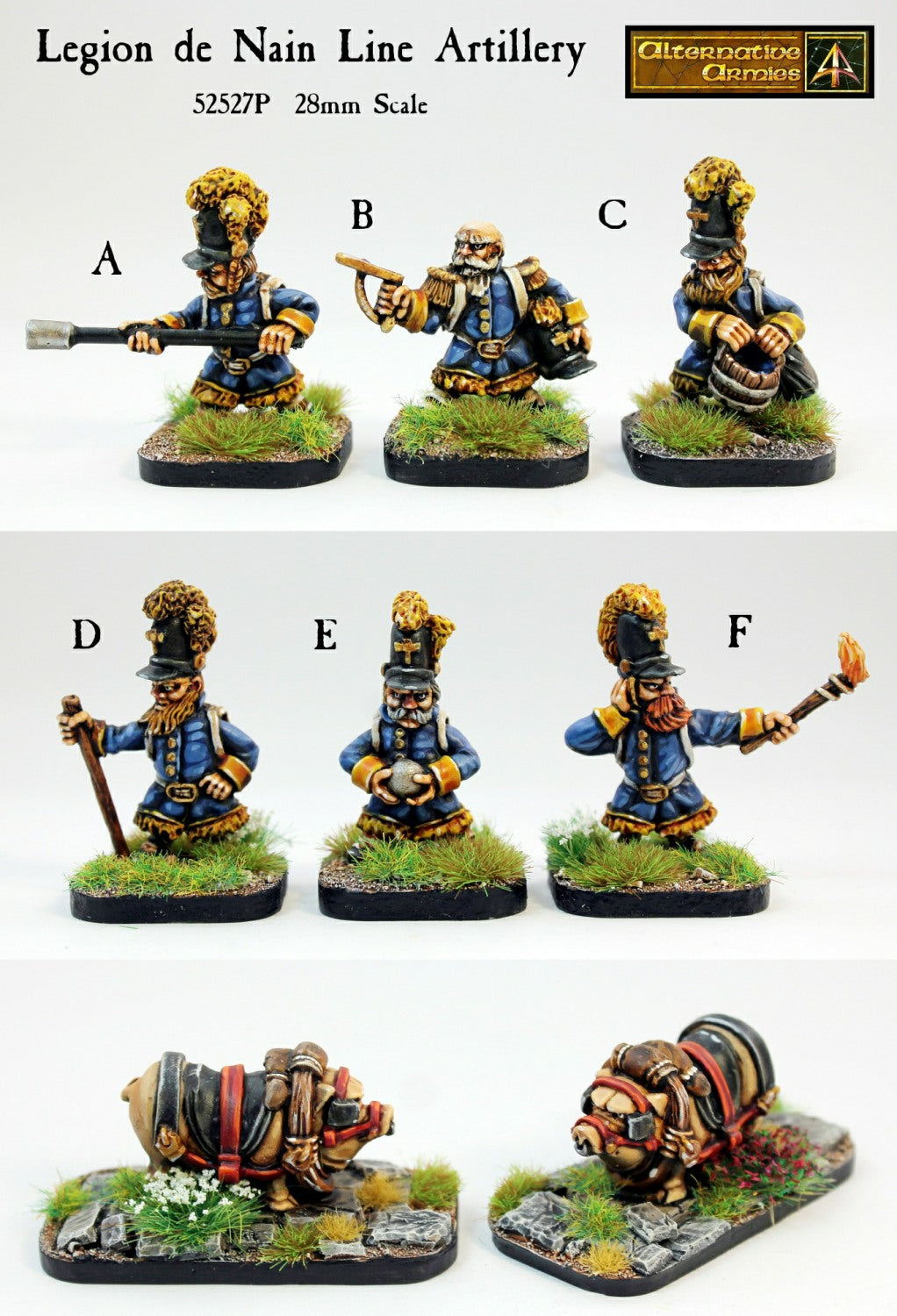 (Officer with Instrument [B], Rammer [A], Bucket [C], Trail Spike [D], Cannon Ball [E], Lighter [F] metal miniatures. Limber Pig x 2 in resin.) Miniatures are from this code. Each Dwarf is about 22mm to the eyeline.
