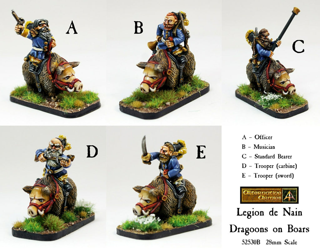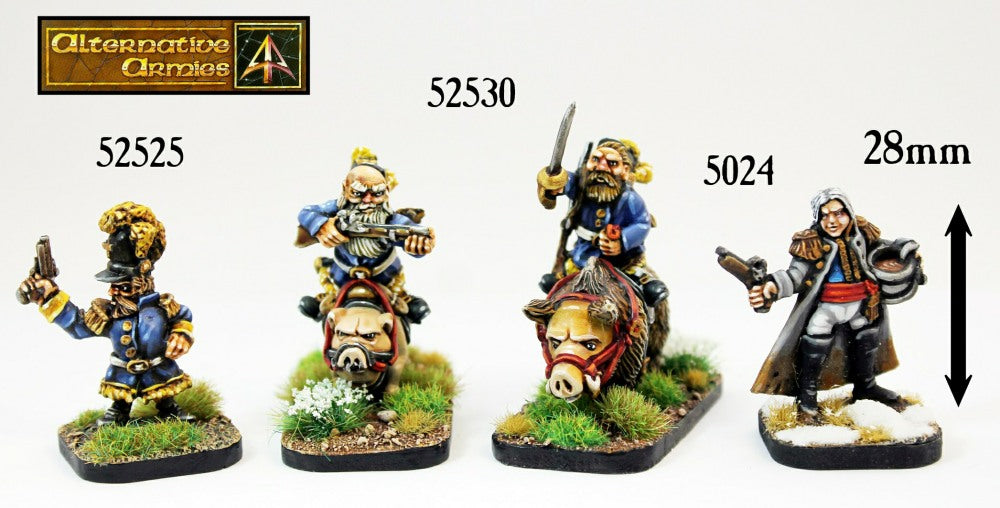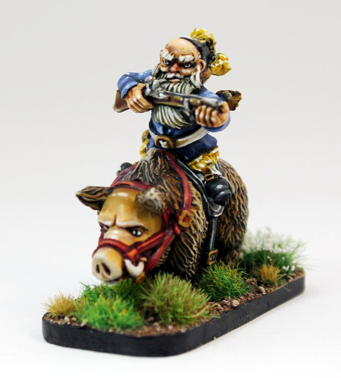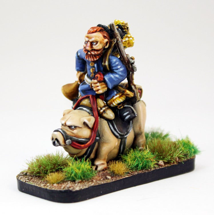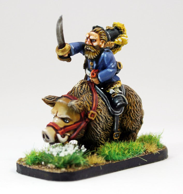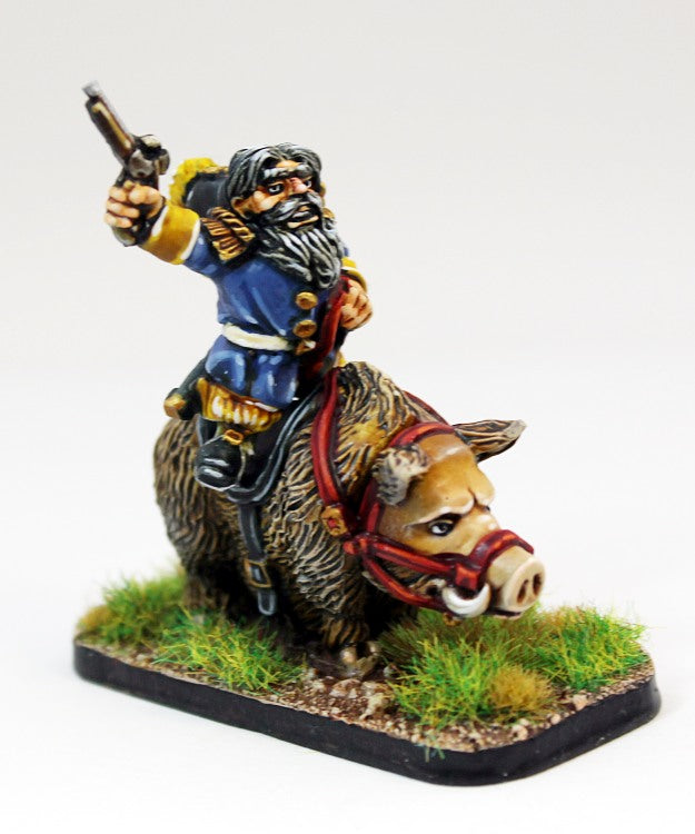 (Dwarf Officer with Pistol, Musician with Trumpet, Standard Bearer and two poses of Trooper one with Sword and the other with Carbine) on big boars.