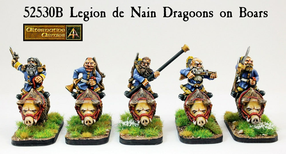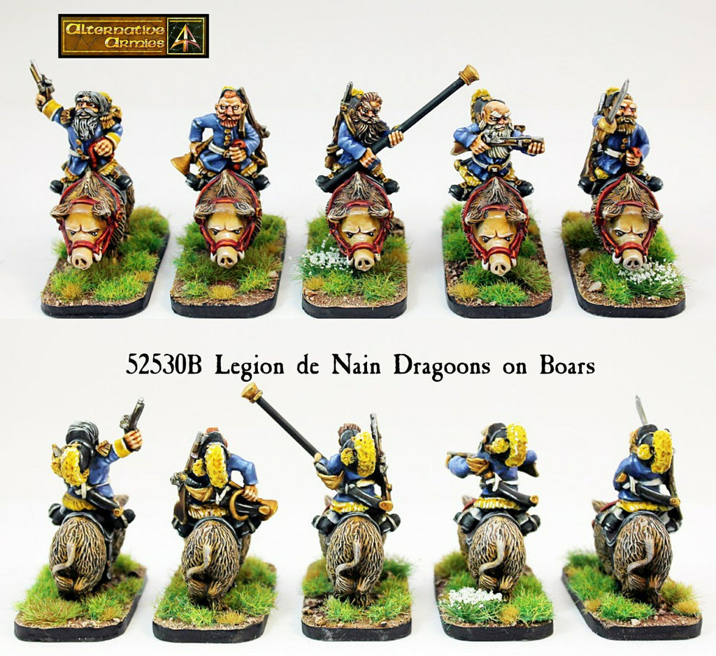 The Legions de Nain come from the tiny stattes of the Confederation of Finkelstein and are drawn into the huge legions before being fielded for the Ferach Empire. These Dwarves wear the Raupenhelm pushed back and carry carbines and short swords as scouts and harriers. They ride upon boars.