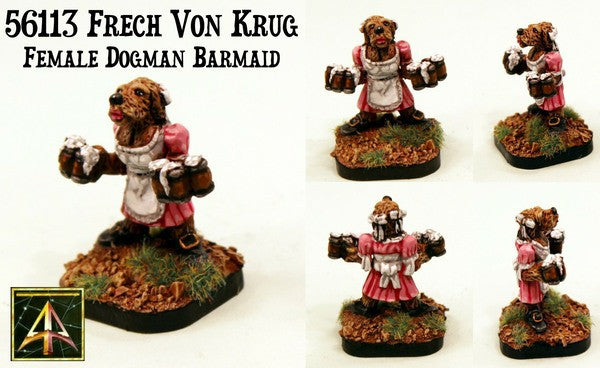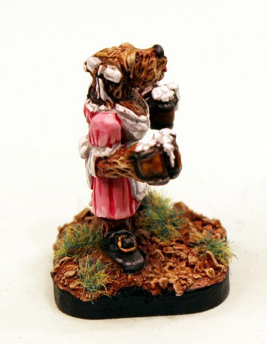 This pack contains one 28mm scale metal multiple part miniature. A young female Dogman in dress carrying six flagons of ale. Supplied with separate arms allowing a degree of fine posing.