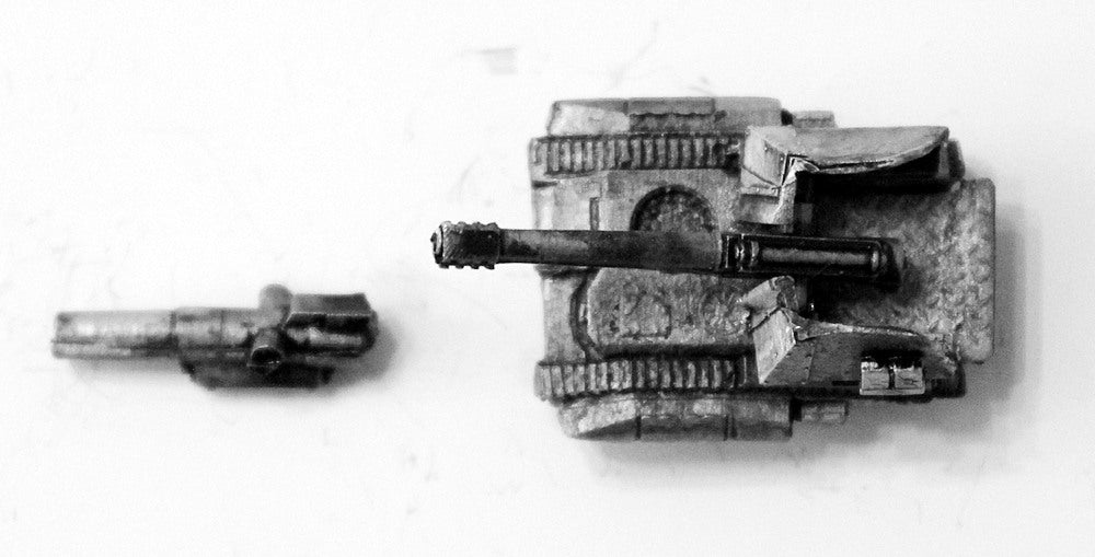 White Metal Kit. Hull plus two choices of gun barrel allowing assembly of self propelled gun in two types. (25mm long assembled)