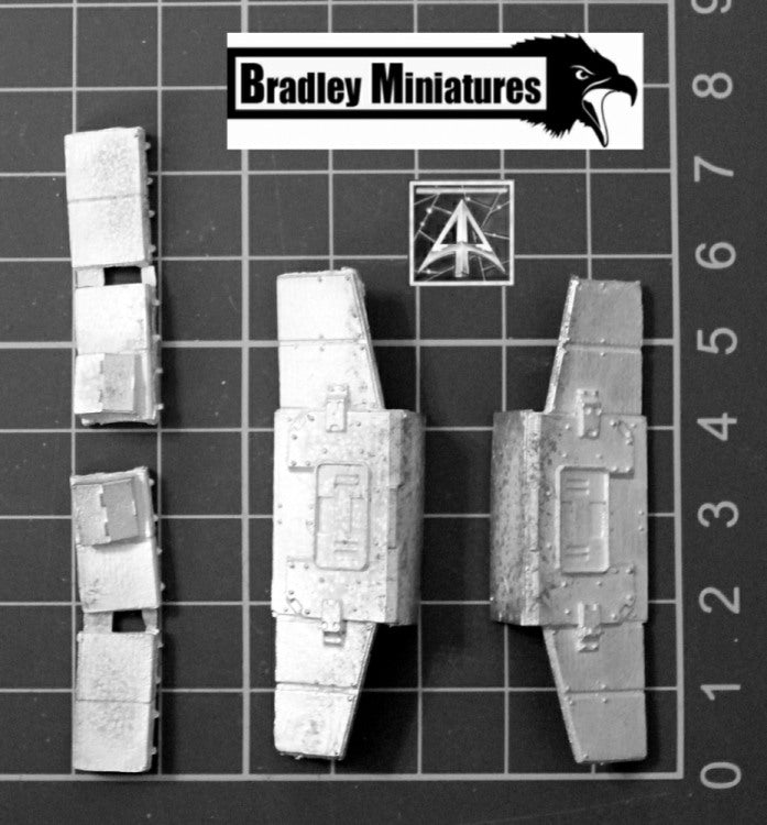 This code contains two 15mm scale metal side armour skirts sets with fixings. One left and one right for use with any vehicle put primarily the Lionheart and Stormheart tanks.