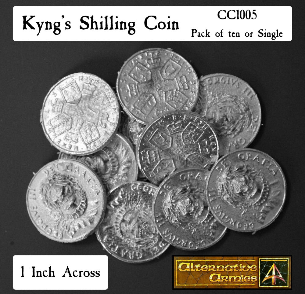 Originally used as a promotional item in the 1990's we have the famous 'Kyngs Shilling' coin of Kyng Gorge III of Greate Britorcn and its Valon spanning empire. You can now get the coin for yourself. For your collection or for use on table as markers.