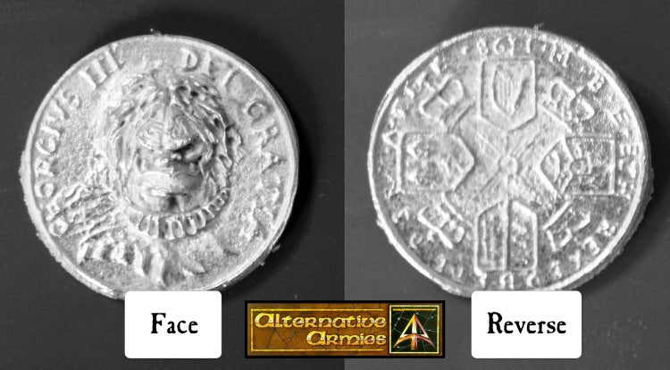 The coin is one inch across (25mm) and features the face of the king on one side and the marks of all four countries of Britorcn (Albion, Joccia, Taffsea and Guinalea) on the reverse.
