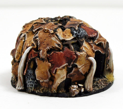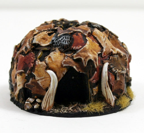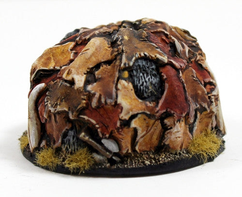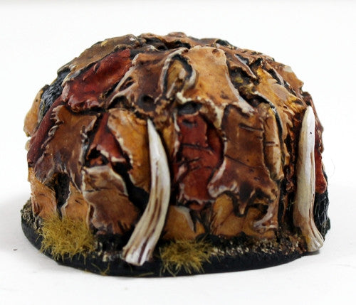 This 15mm scale one piece highly detailed resin building requires no assembly. Suitable for any Orc campaign in a fantasy wargaming world it depicts the dwelling of those on the with a little more space. A crudely assembled tent like structure covered in layers of animal (and other things!) skins. An open hole lets smoke out from cooking fires and two large tusks frame the doorway and two more support the rear of the building along with some rocks and a smashed human rib cage. This building is 50mm across and 30mm tall.