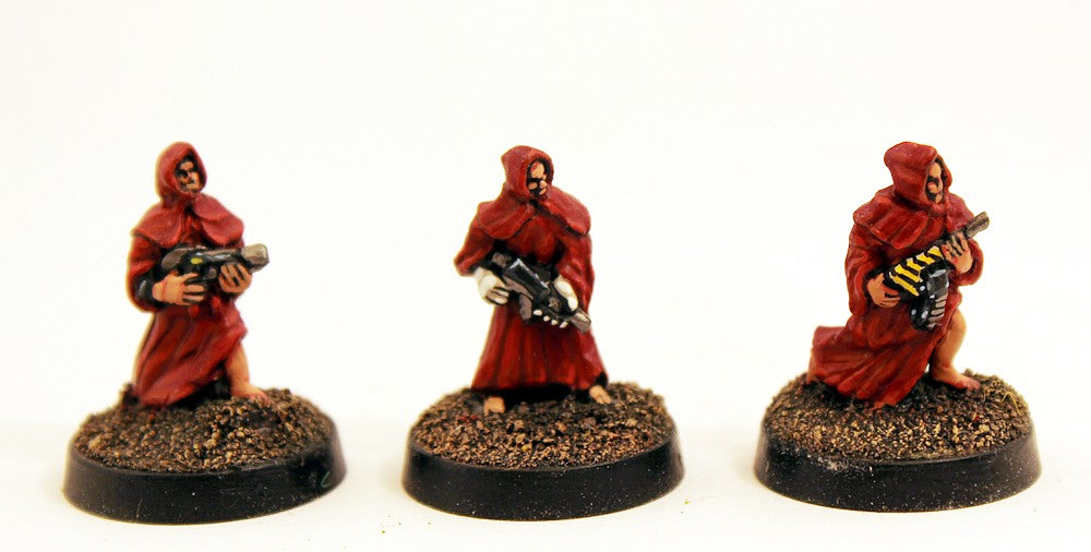 10 Miniatures. This pack contains ten Human miniatures in three different poses. Cultists in hooded robes armed with a variety of projectile weapons. Suitable for use in any modern, near future or science fiction setting that involves Cults. Use these miniatures as your main infantry.