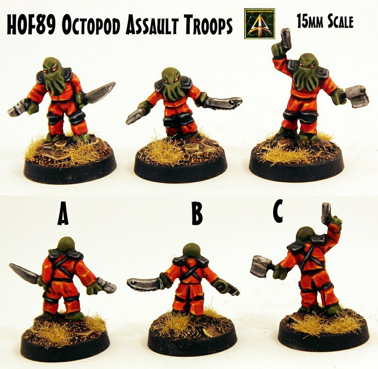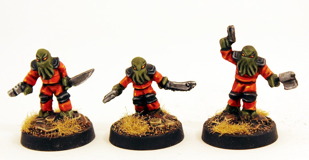 10 Miniatures. This pack contains ten 15mm miniatures taken from three poses of humanoid infantry assault troops. Armed with pistols, swords, knives and a chainsaw these Octopods are perfect for the close in work required to shift tricky enemies for held positions. Octopods have slimy skin and tentacle bunches which cover the lower parts of their faces and chests. Get a melee fixated pack for your force.