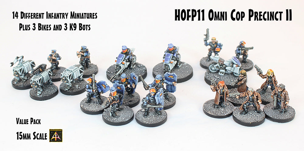 An expanded sampler for skirmishing. A total of fourteen different metal15mm miniatures plus three metal 15mm bikes and three metal K9 Bots from codes HOF202, HOF203, HOF205, HOF209 and HOF201. A great way to expand this force beyond HOFP10 with a saving.