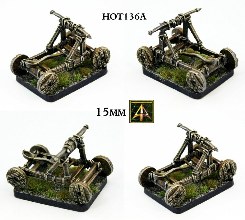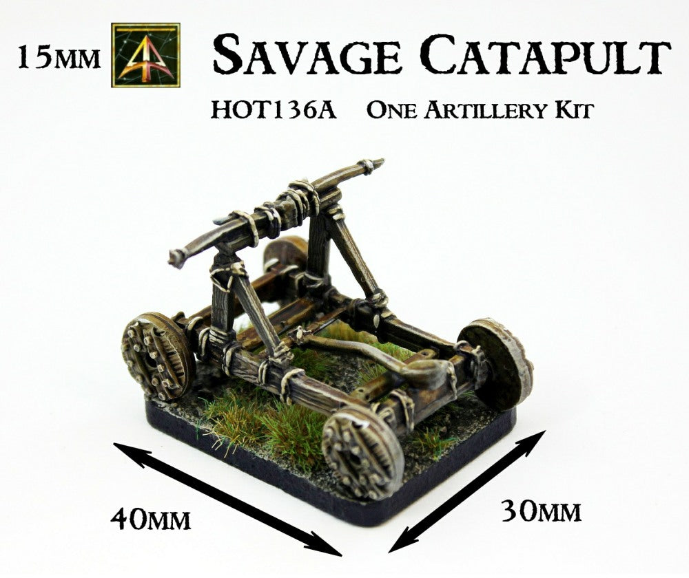 This code contains one 15mm scale multiple piece metal kit to build a four wheeled catapult covered in animal hides and such detail. Ideal for any primitive, barbaric or chaotic force.