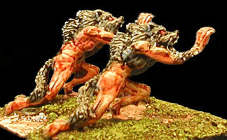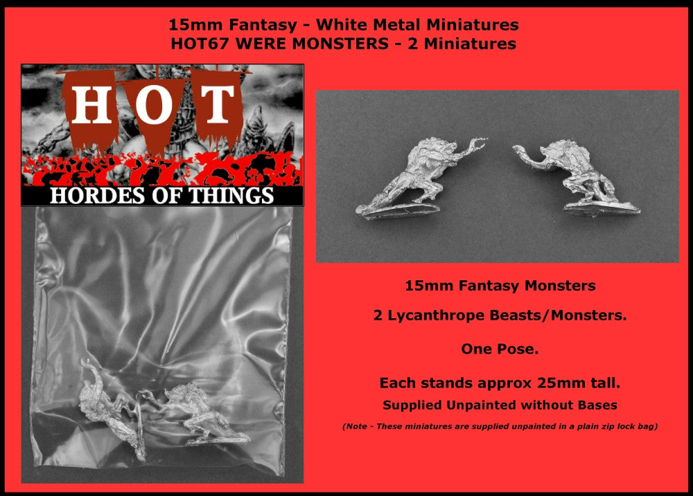 This code contains two identical metal monsters. Large werewolf type creatures such as Ogres or Trolls turned lycanthrope. One piece castings and stand 22mm tall. All miniatures are supplied unpainted and without bases.