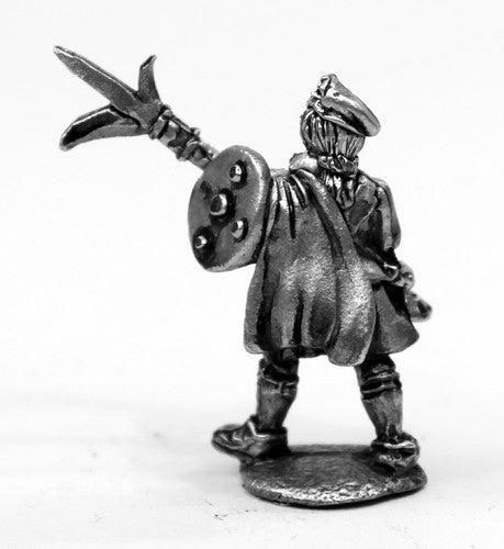 A 28mm scale white metal miniature attacking with three bladed polearm.