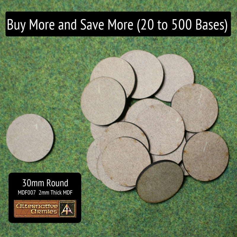 Wooden MDF Bases which are 30mm Round. They are 2mm thick and very durable. Give your miniatures a solid standing on the gaming table.