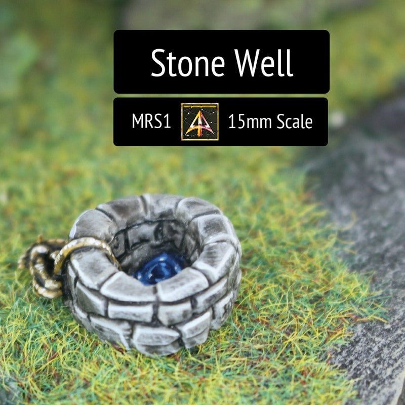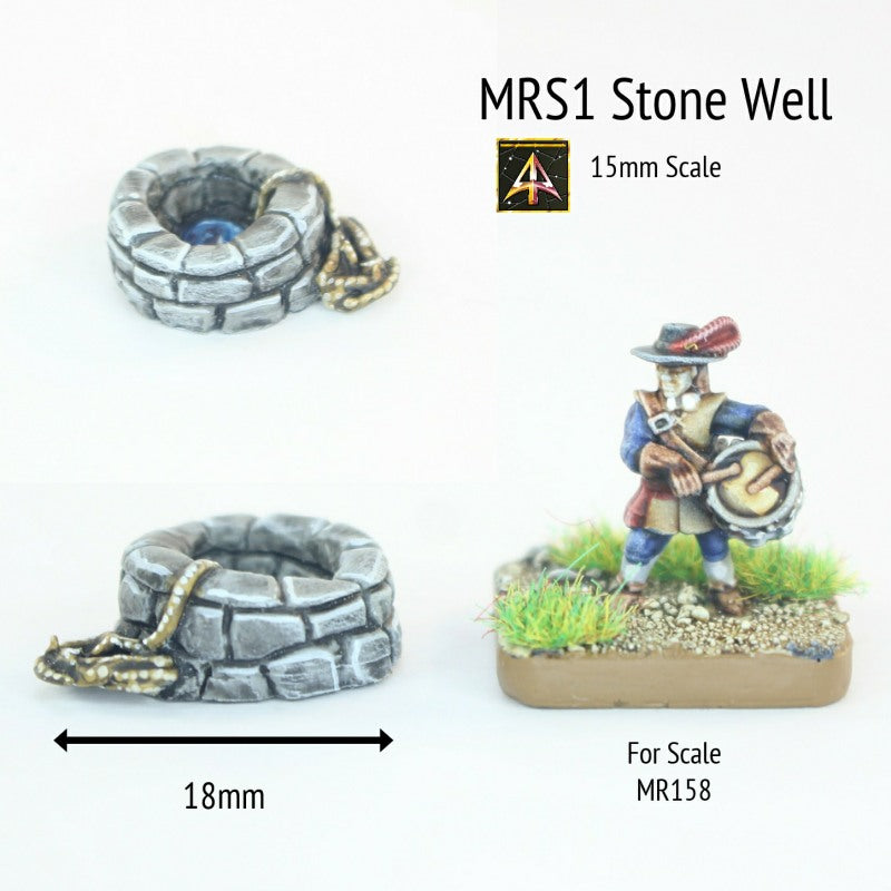 This pack contains one single 15mm metal piece depicting a round stone well with a coil of rope next to it. Useful for any historical or such setting. It is approximately 18mm across. Supplied unpainted and without a base.
