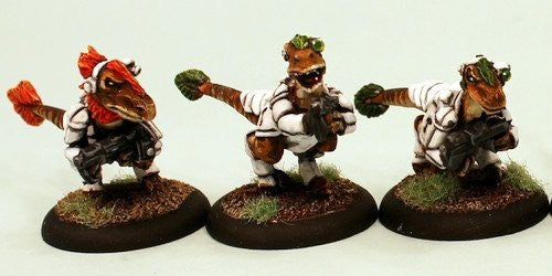 This value pack contains three different poses of 28mm Space Raptor's in metal. Alpha Leader with Energy Rifle (A), One SAW Trooper (B), One Plasma Gunner (C). Great for all your near or far future skirmish and battle games.