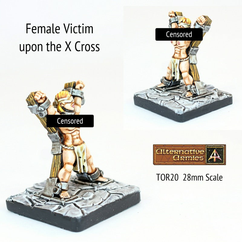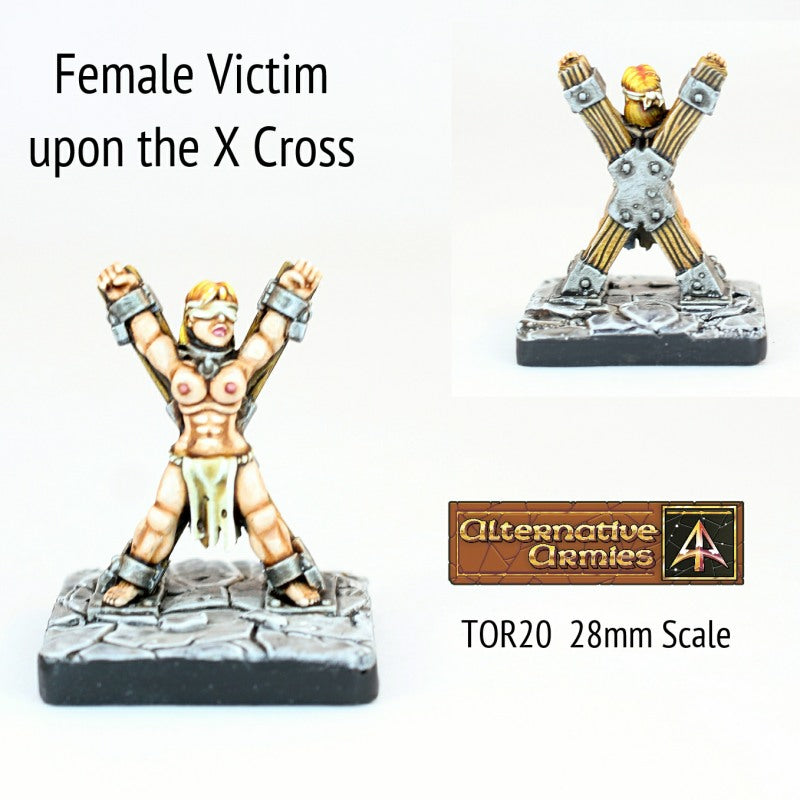 Contains One metal miniature in 28mm scale. A bound and blindfolded female victim attached to a wooden 'X' cross. For use in dioramas or dungeon crawl type games and settings. Victim is 28mm to eyeline.