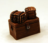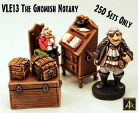This pack contains a Gnome in sitting position along with a thick book and a chair upon which to sit, along with a writing desk in two pieces as well as a travelling chest and two small boxes; lastly a Half Ogre guard with pistol. The set requires a small amount of assembly and pieces can be established using our image of parts as given. The insert supplied can be had as a free PDF too on our free downloads page in the Stacks. A unique and characterful set useful in any collection.